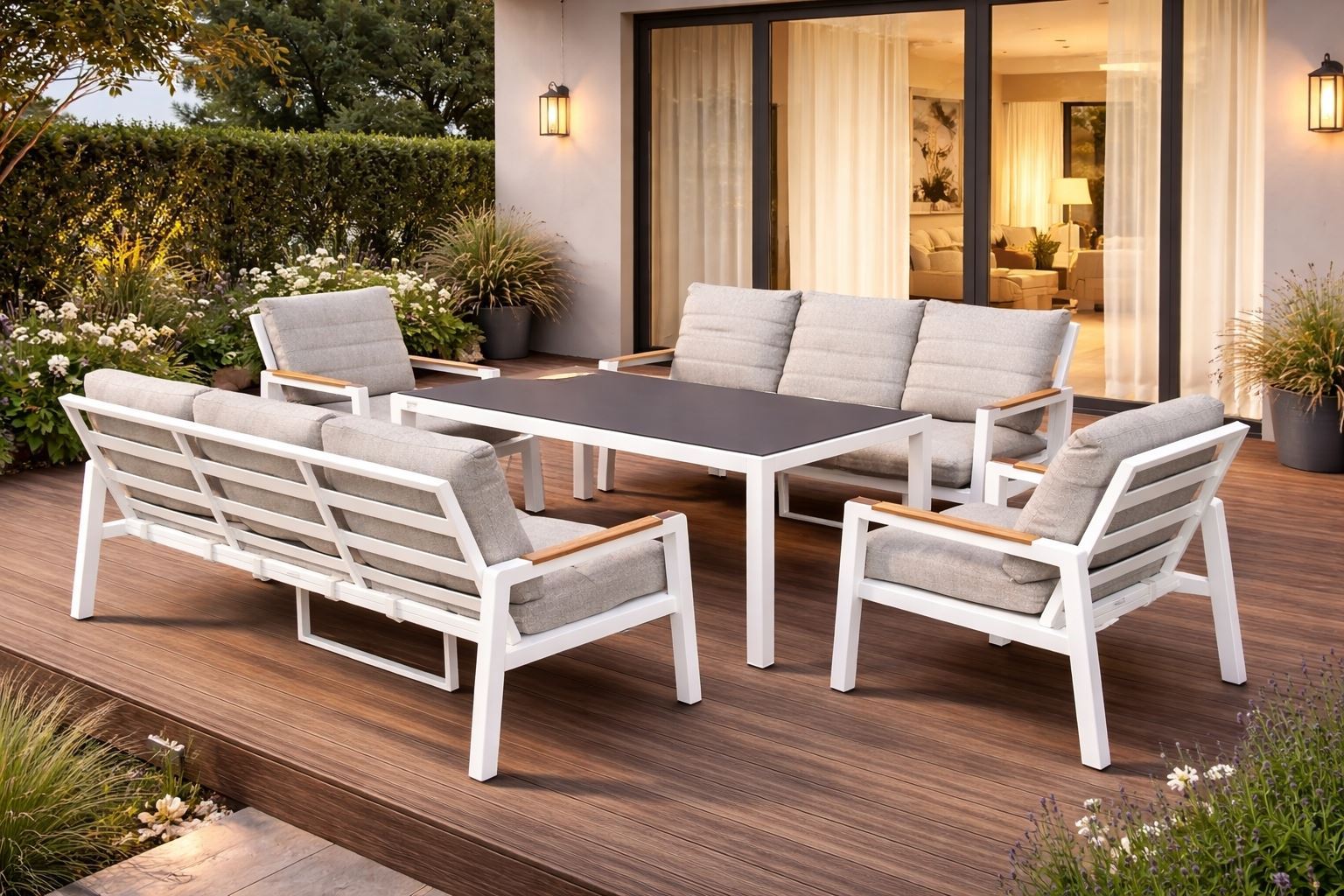 Zestaw mebli aluminiowych od Just Relax: 2 Sofy Miami + stół + 2 fotele Białe