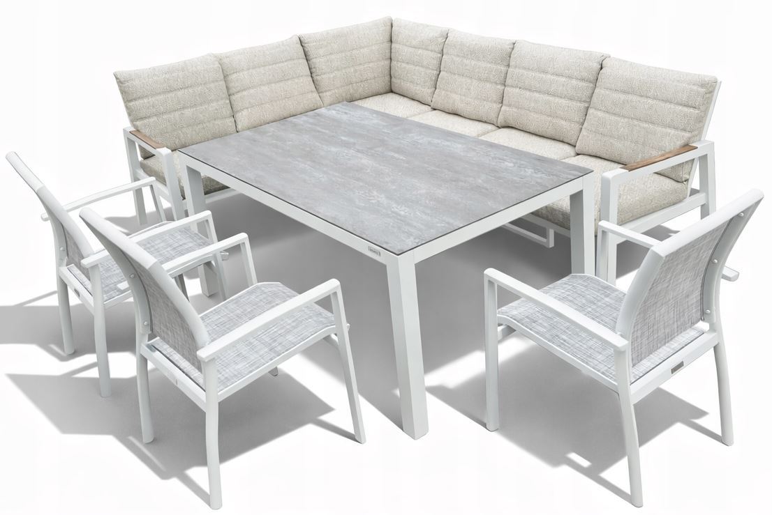 Zestaw mebli aluminiowych od Just Relax: Narożnik Chicago + Stół + 3 Krzesła Biały