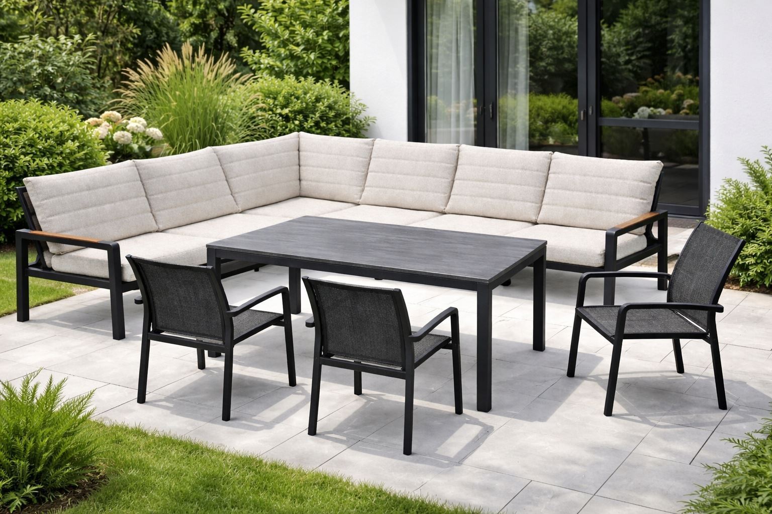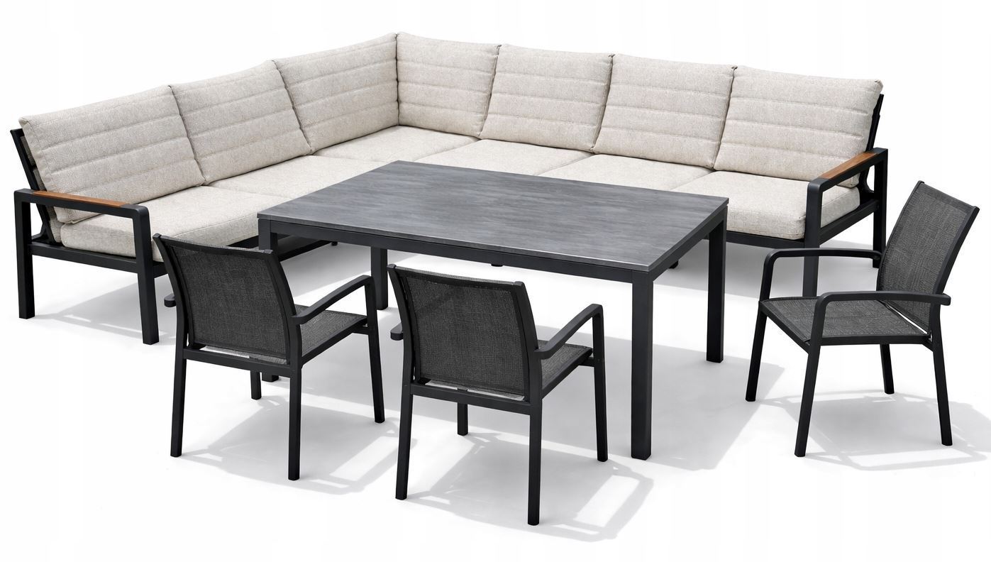 Zestaw mebli aluminiowych od Just Relax: Narożnik Chicago + stół + 3 krzesła Grafitowe