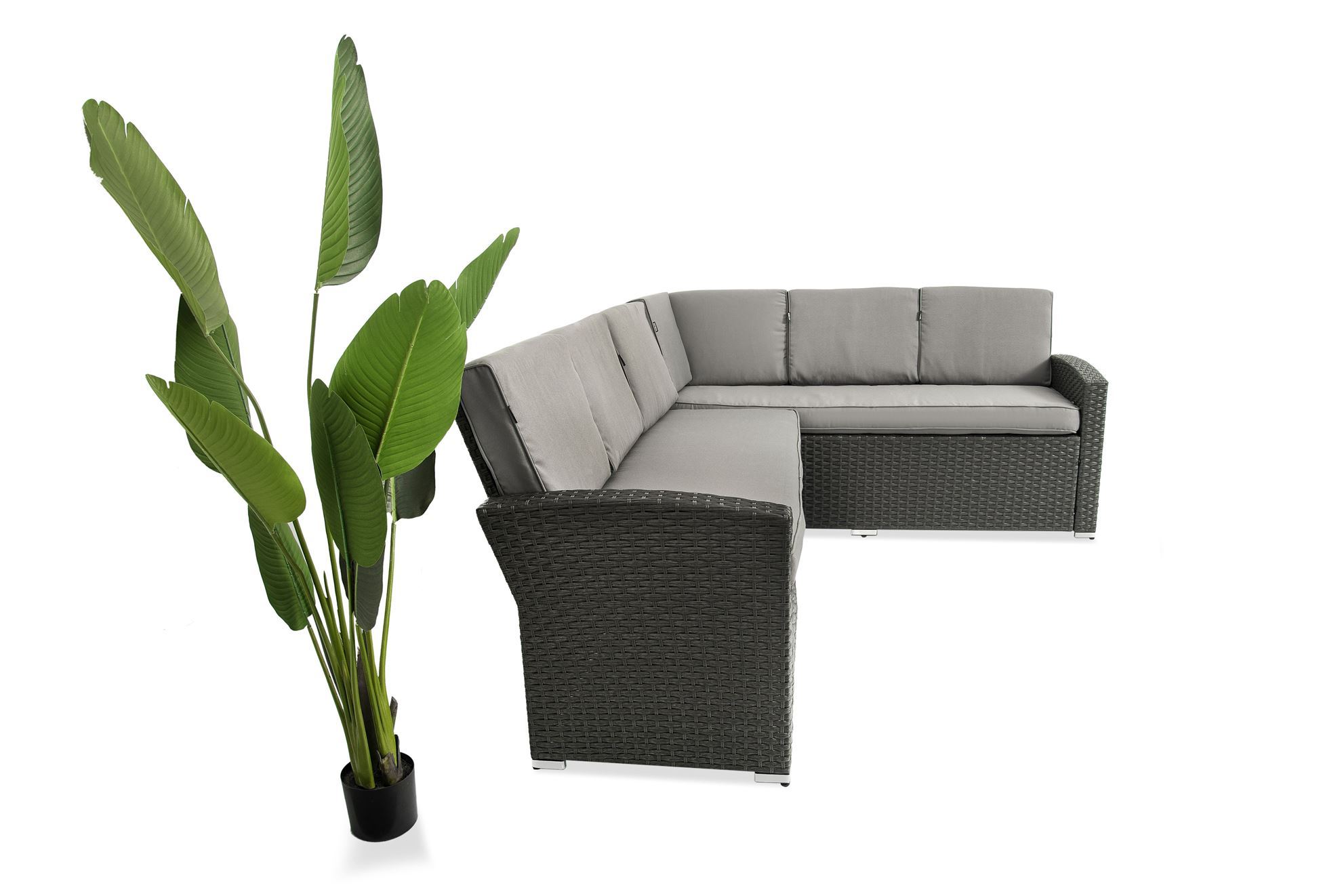 Zestaw składa się z 2 narożników. Na siedziskach znajdują się poduszki o grubości 10 cm z wodoodpornymi, zdejmowanymi pokrowcami, które łatwo możesz ściągnąć do wyprania, a jednocześnie nie musisz martwić się o deszczową pogodę.