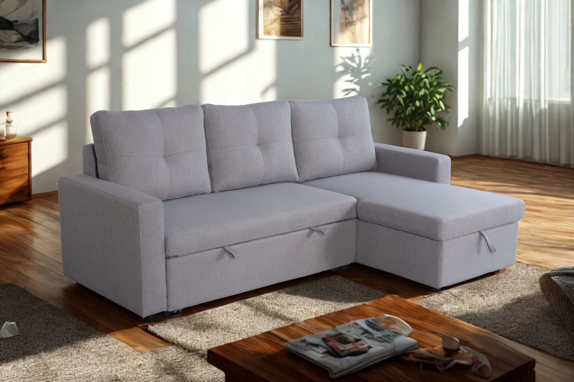 Nowoczesny narożnik Bergamo w wersji LEWEJ lub PRAWEJ, w dwóch uniwersalnych kolorach: szarym i beżowym. Perfekcyjny do salonu, mieszkania, apartamentu czy pokoju gościnnego. Łączy codzienne wygodne siedzenie z praktyczną funkcją spania – szybko rozkładasz i śpisz jak w łóżku!