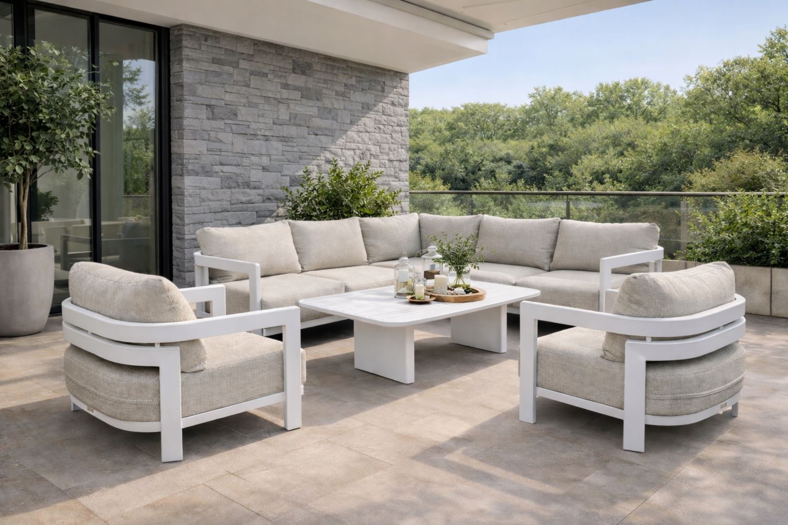 Aluminiowy zestaw mebli ogrodowych MALIBU – narożnik + 2 fotele + stolik
