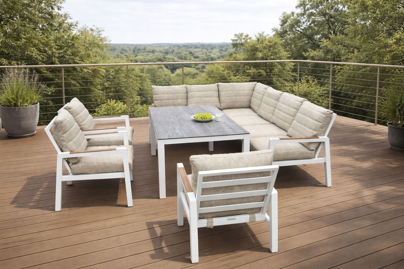 Zestaw mebli aluminiowych od Just Relax: Narożnik Chicago + Stół + 3 Fotele Biały