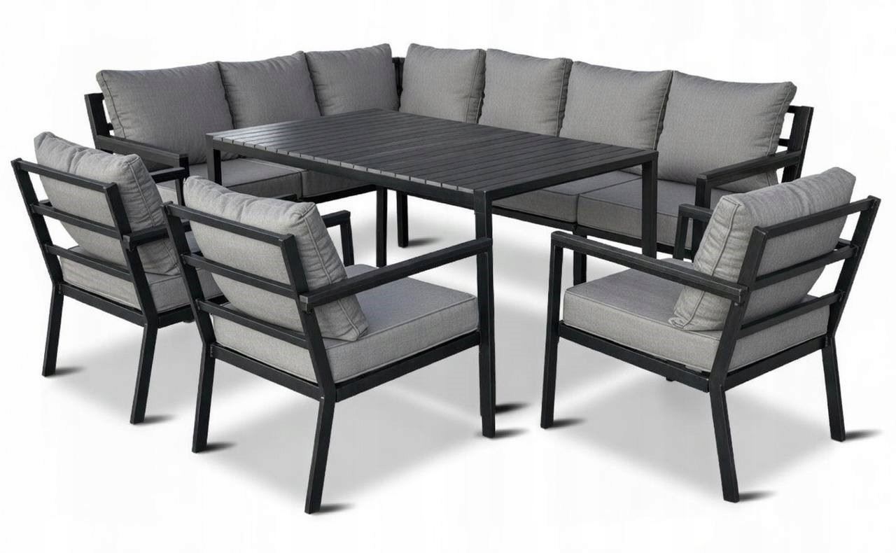 Zestaw Loft Line to stylowe i funkcjonalne rozwiązanie dla osób ceniących wygodę i nowoczesny design w przestrzeni zewnętrznej. Doskonale sprawdzi się w ogrodzie, na tarasie lub w oranżerii. Komplet wykonano z trwałych materiałów, co gwarantuje długą żywotność i łatwość w pielęgnacji. Czarna kolorystyka i minimalistyczna forma nadają mu uniwersalny charakter, który dobrze komponuje się z różnymi aranżacjami. W skład zestawu wchodzą: narożnik (złożony z dwóch sof), dwa fotele oraz solidny stół.