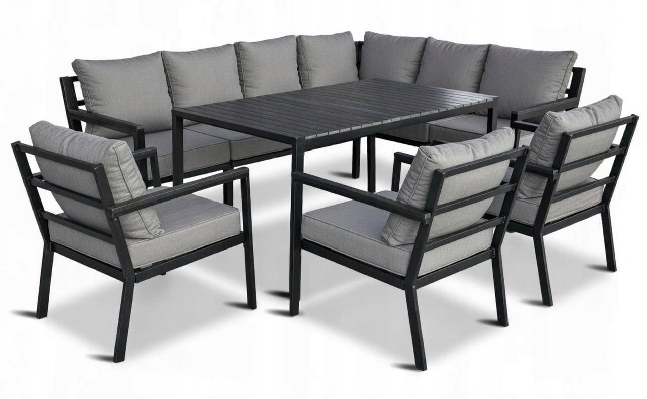 Zestaw Loft Line to stylowe i funkcjonalne rozwiązanie dla osób ceniących wygodę i nowoczesny design w przestrzeni zewnętrznej. Doskonale sprawdzi się w ogrodzie, na tarasie lub w oranżerii. Komplet wykonano z trwałych materiałów, co gwarantuje długą żywotność i łatwość w pielęgnacji. Czarna kolorystyka i minimalistyczna forma nadają mu uniwersalny charakter, który dobrze komponuje się z różnymi aranżacjami. W skład zestawu wchodzą: narożnik (złożony z dwóch sof), dwa fotele oraz solidny stół.